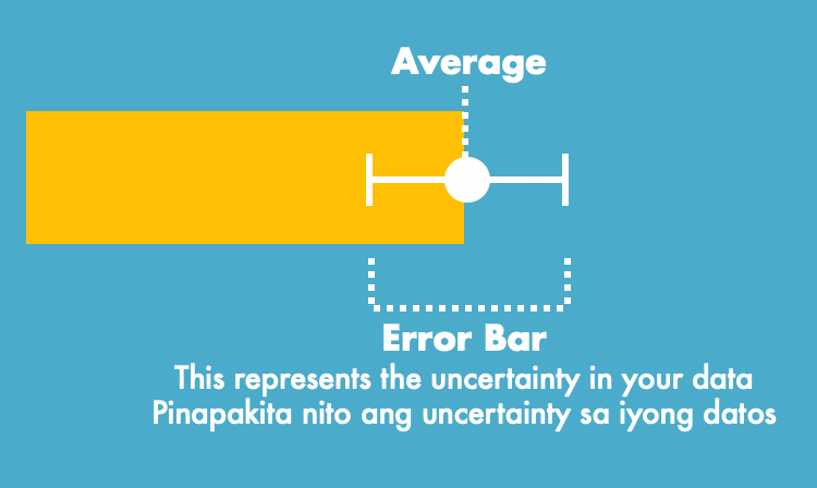 Baka may mapansin ka sa bar graph. Ano ang pinapakita ng mga thin lines? Ito ang error bars at nagpapakita ito ng uncertainty (kawalan ng katiyakan) sa iyong datos. May posibilidad na ang totoong halaga ng blood sugar ay hindi ang average, kundi ito ay maaaring makita sa loob ng range ng error bars. Ibig sabihin, kahit na medyo mas mataas ang average ng blood sugar ng mga manggagawa, kung nag-o-overlap ang error bars ng daalwang grupo, may posibilidad na pareho lang ang dalawang halaga. Sa madaling salita, hindi natin masasabi mula sa graph na mas mataas ang blood sugar ng mga factory workers kaysa sa karaniwang tao.